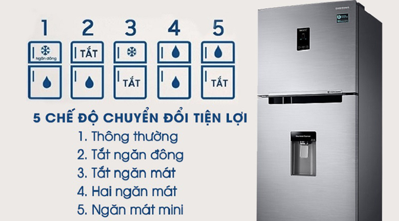 Tích hợp 5 chế độ chuyển đổi cho tủ lạnh dễ dàng phù hợp với từng nhu cầu của bạn vừa gia đình: chế độ thông thường, chế độ tắt ngăn đông, chế độ tắt ngăn mát, chế độ hai ngăn mát, chế độ ngăn mát nhỏ. Bộ điều chỉnh nhiệt độ được đặt ở bên ngoài của sản phẩm, bạn sẽ lựa chọn dễ dàng từng chế độ theo nhu cầu cá nhân.